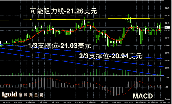 白银阴阳烛录得整体横盘运行,阴阳烛间隔出现,且处于红色日均线中位,短线MACD显示弱势多头主导,后期白银价格或小幅上扬至21.2美元线。