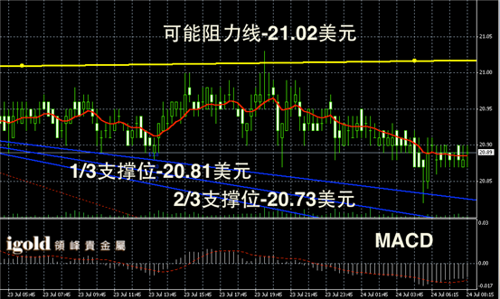 阴阳烛录得整体阴烛较多,柱体小幅低于红色日均线,短线MACD显示弱势空头主导,白银价格近期在20.9美元线附近的横盘运行趋势较为明显,预期或以非常小的幅度逐步下探至20.8美元线附近。