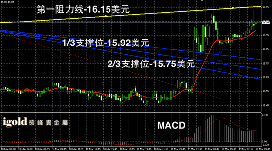 白银阴阳烛录得上升后已经回调至红色日均线中位,短线MACD显示多头主导,白银价格上午短线或向15.9美元附近回落,低位支撑可参考15.85美元附近。