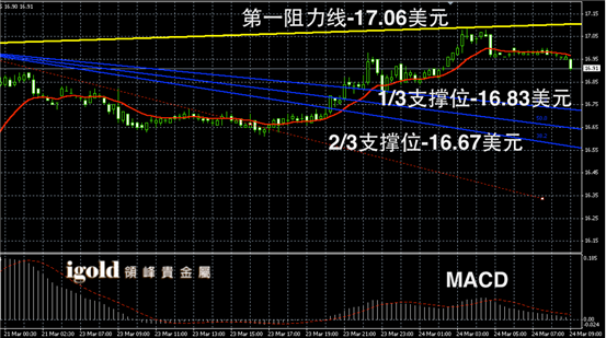 白银阴阳烛录得后期阴烛小幅回落,短线MACD显示呈中性,白银价格上午或小幅下探16.85美元附近,上午市场整体偏于弱势偏空运行。