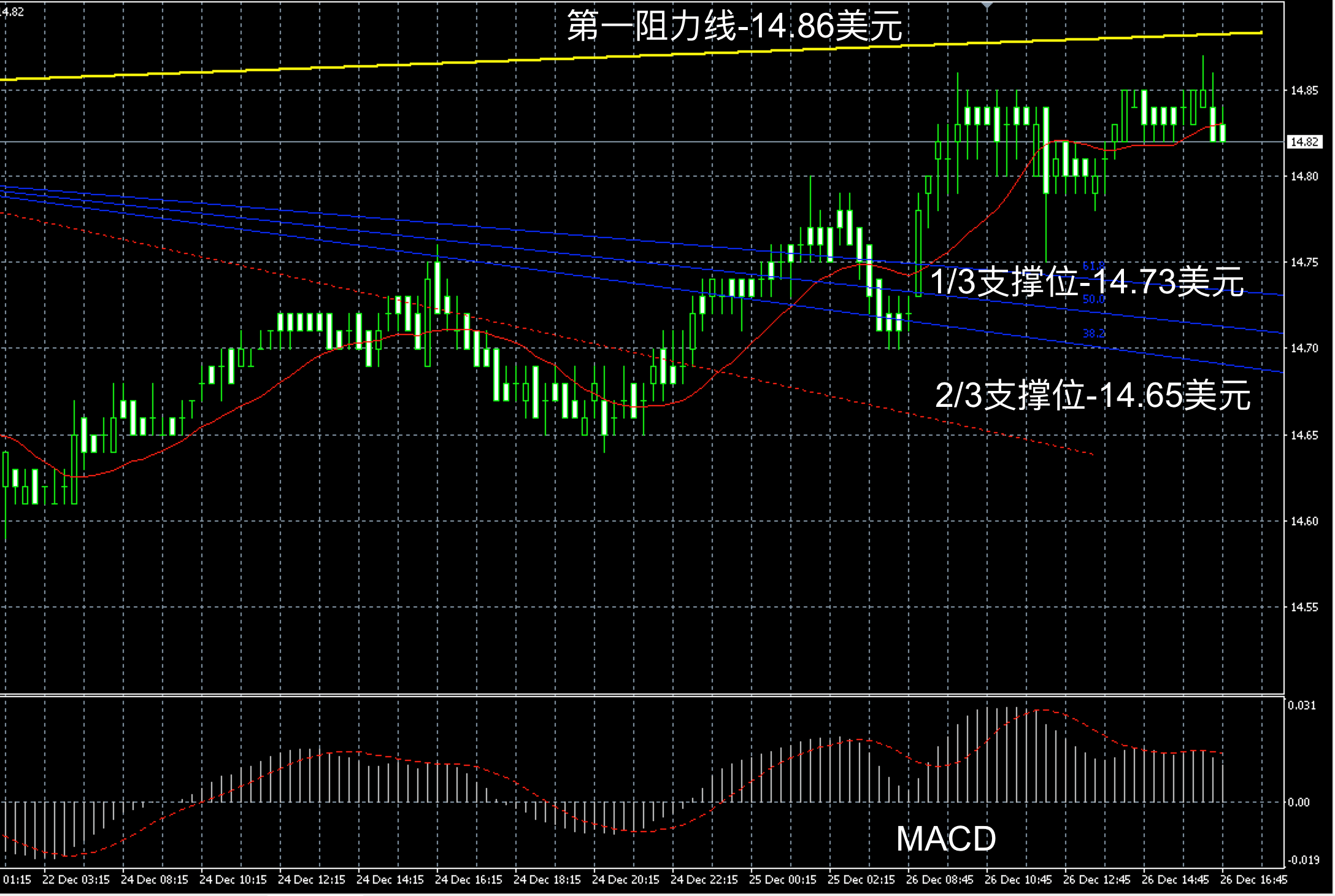白银阴阳烛录得小幅上探,末端处于红色日均线中位,短线MACD显示呈中性,白银价格晚上或在14.8美元附近运行,多空扩大信号可分别参考14.93和14.67美元附近,短线若有突破可顺势看涨看跌1-2美元左右。