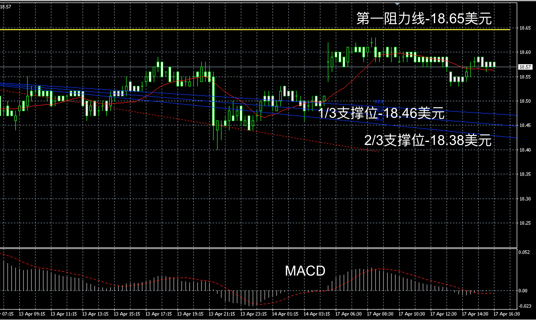 白银阴阳烛录得柱体较短,末端处于红色日均线中位,短线MACD显示呈中性,白银价格晚上或围绕18.6美元附近震荡,高低多空扩大信号可分别参考18.65和18.52美元附近。