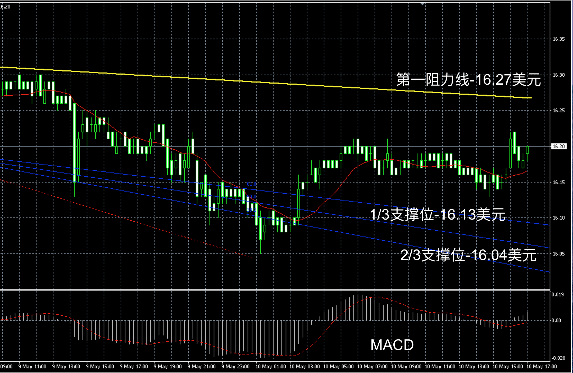 白银阴阳烛录得柱体小幅反弹,末端处于红色日均线中位,短线MACD显示呈中性,白银价格晚上或围绕16.2美元附近弱势盘整,高低多空扩大信号可分别参考16.30和16.13美元附近。