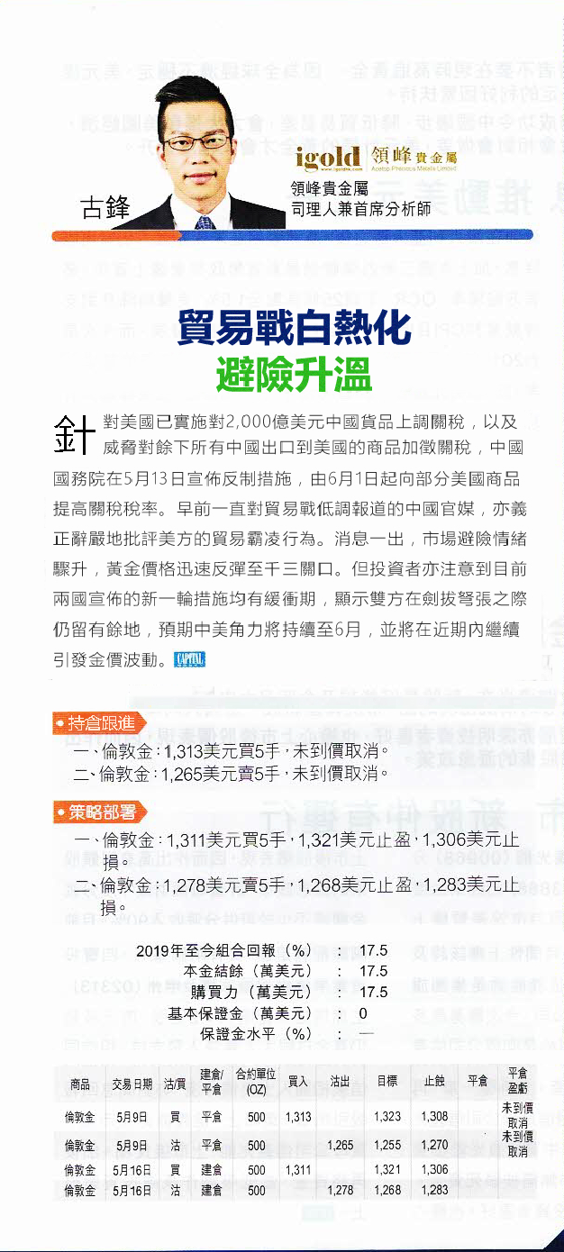 针对美国已实施对2,000亿美元中国货品上调关税,以及威胁对余下所有中国出口到美国的商品加征关税,中国国务院在5月13日宣布反制措施,由6月1日起向部分美国商品提高关税税率。早前一直对贸易战低调报道的中国官媒,亦义正辞严地批评美方的贸易霸凌行为。消息一出,市场避险情绪骤升,黄金价格迅速反弹至千三关口。但投资者亦注意到目前两国宣布的新一轮措施均有缓冲期,显示双方在剑拔弩张之际仍留有余地,预期中美角力将持续至6月,并将在近期内继续引发金价波动。