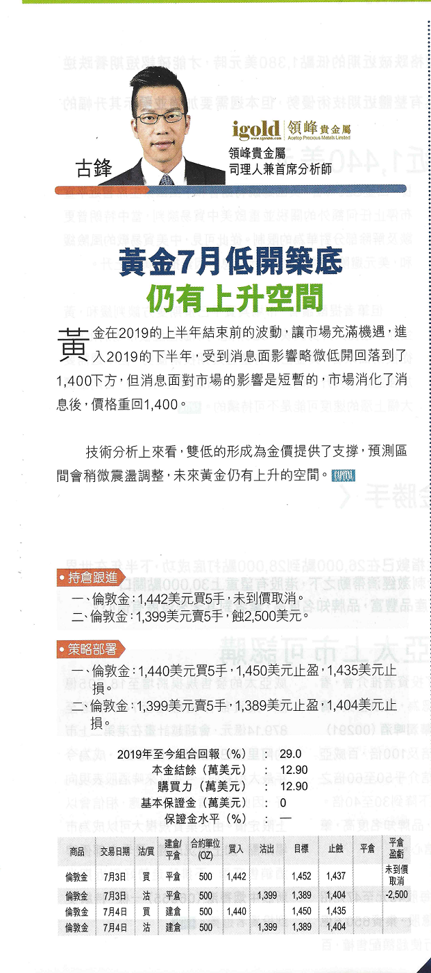 黄金在2019的上半年结束前的波动,让市场充满机遇,进入2019的下半年,受到消息面影响略微低开回落到了1400下方,但消息面对市场的影响是短暂的,市场消化了消息后,价格重回1400。技术分析上来看,双低的形成为金价提供了支撑,预测区间会稍微震荡调整,未来黄金仍有上升的空间。