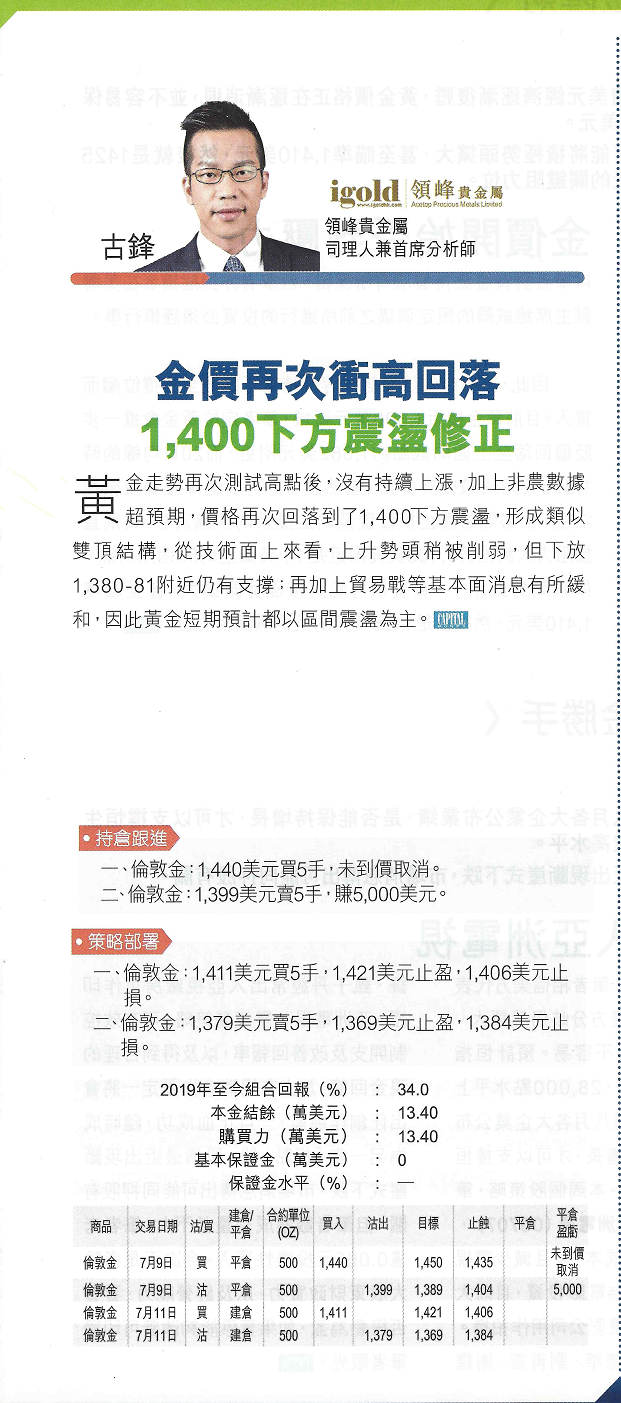 二、伦敦金,1,399美元卖5手,赚5,000美元。
