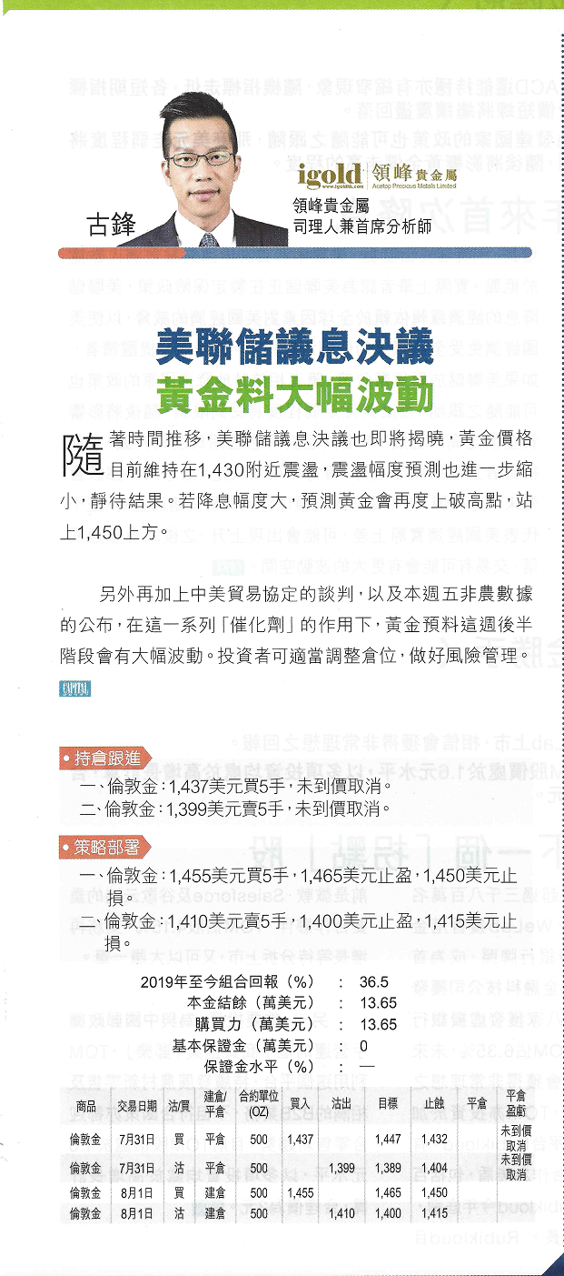 随着时间推移,美联储议息决议也即将揭晓,黄金价格目前维持在1430附近震荡,震荡幅度预测也进一步缩小,静待结果。若降息幅度大,预测黄金会再度上破高点,站上1450上方。另外再加上中美贸易协议的谈判以及本周五非农数据的公布,在这一系列“催化剂”的作用下,黄金预料这周后半阶段会有大幅波动。投资者可适当调整仓位,做好风险管理。