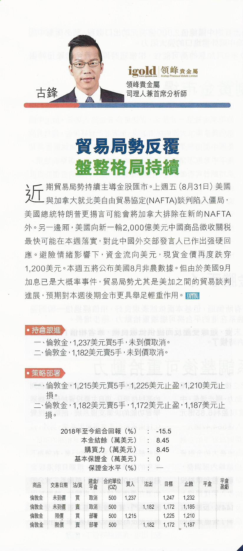 近期贸易局势持续主导着金股汇市。上周五(8月31日)美国与加拿大就北美自由贸易协定(NAFTA)谈判陷入僵局,美国总统特朗普更扬言可能会将加拿大排除在新的NAFTA之外。另一边厢,美国向新一轮2,000亿美元中国商品征收关税最快可能在本周落实,对此中国外交部发言人已作出强硬回应。避险情绪影响下,资金流向美元,现货金价再度跌穿1,200美元。本周五将公布美国8月非农数据。但由于美国9月加息已是大概率事件,贸易局势尤其是美加之间的贸易谈判进展,预期对本周后期金市更具举足轻重作用。