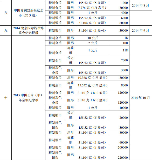 此次发行的10个项目分别为:2014版熊猫金银纪念币、中国探月首次落月成功金银纪念币、第二届夏季青年奥林匹克运动会金银纪念币、中国-法国建交50周年金银纪念币、中国佛教圣地(峨眉山)金银纪念币、世界遗产——杭州西湖文化景观金银纪念币、新疆生产建设兵团成立60周年金银纪念币、中国青铜器金银纪念币(第3组)、2014北京国际钱币博览会纪念银币和2015中国乙未(羊)年金银纪念币。