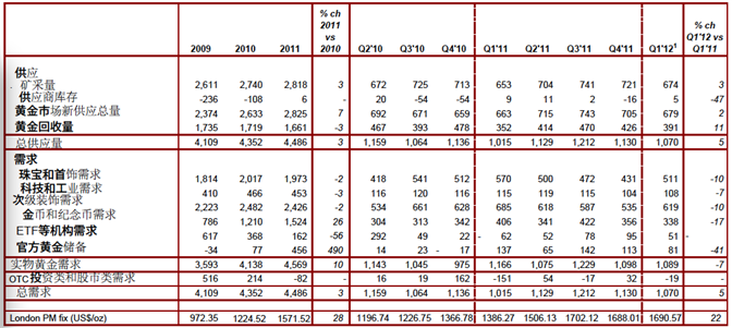 目前全球黄金消费按照地区分配排名依次为:印度全球黄金消费28%,大中华地区黄金消费占21%,中东和土耳其地区占13%,欧元区和俄罗斯占12%,其他地区占19%,未来中国内陆黄金消费的增加,可能会超过印度。大部分投资银行预测2012年中国黄金消费或超过印度成为黄金消费第一大国。那么,对于实物黄金的供应与需求的调查则可以窥测2012年第三季度黄金实物消费对其价格的影响。