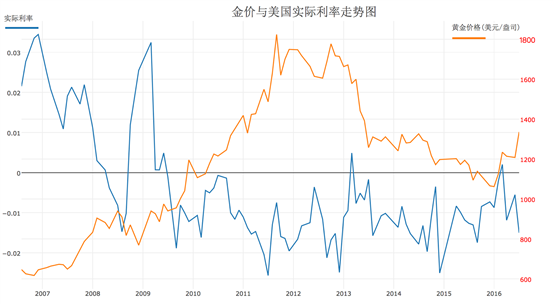 由于过去30年来,美国长期实际利率整体处于下行趋势,这与同期黄金价格处于上升趋势相契合。下图将两者2006年之后的走势进行对比,可以很明显发现,黄金价格的大幅上涨是从2010年前后美国实际利率下降至0轴以下后开始的。当美国实际利率在-0.02附近低位时,黄金价格触及至历史高位1700-1800美元区间。后期实际利率触底反弹后,金价便有所走跌。然而2016年后实际利率再从0轴附近走跌,逼近-0.02附近,黄金价格因此再次大幅反弹。