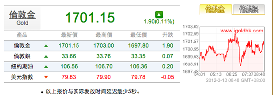 领峰贵金属 13-03-2012 早评 金银走势平稳,静待今日美国新货币政策的发布