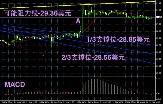 白银阴阳烛录得短线MACD多头减弱趋势明显,且反弹后柱体明显收短,前后阴阳烛间隔出现,没有明显的趋势,预期未来或高位窄幅震荡。震荡区间可参考阳烛A的高低价。