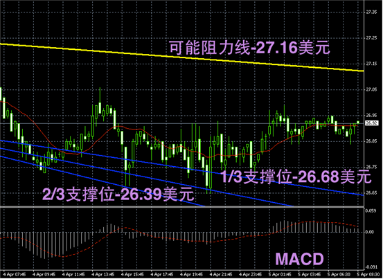 白银阴阳烛录得柱体整体处于红色日平均移动线中位,前后比值差异小,且末端柱体聚焦明显。短线MACD显示弱势多头主导,预期未来或继续窄幅持稳震荡。