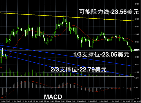 白银长线阴阳烛录得趋势平稳,整体仍在继续上行动力,长线RSI仍在上扬阶段,不过目前录得仅在23附近。