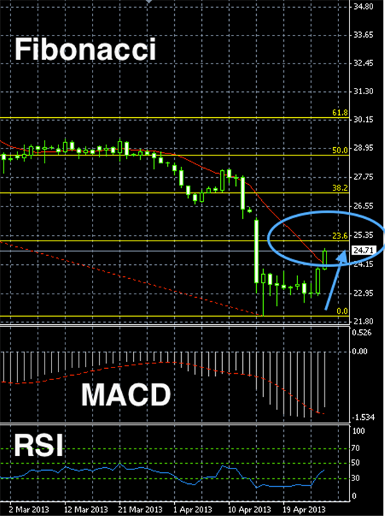 白银此次反弹正逼近Fibonacci低位区间阻力线,未来或表现为不断冲击25.3美元附近。由于长线RSI仍在 30 – 50 区间,所以整体反弹空间较大。