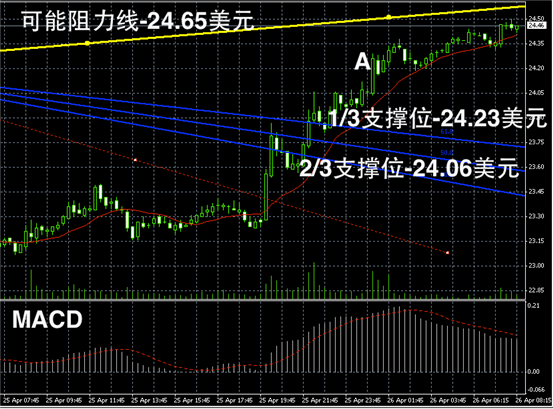 白银阴阳烛录得整体高于红色日平均移动线,且短线MACD多头积聚明显,预期未来或继续小幅反弹,低位支撑可首先参考阳烛A的最高价。