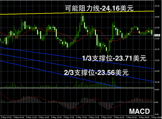 白银阴阳烛录得柱体前后高低交叉于红色日平均移动线,且短线MACD显示空头和多头反复,整体离散率较大,区间震荡趋势明显,短线或延续此前窄幅震荡的趋势。