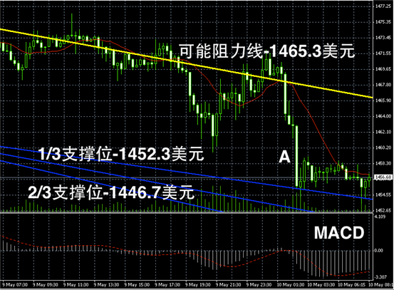 黄金长线震荡仍然未能突破1450 – 1480 美元区间,预期未来或继续在这个区间震荡。长线RSI在逼近50后,多次回落,目前方向转为下行。长线MACD录得DIF线持平。未来黄金如果跌破1450美元支撑位,则可能大幅走跌。