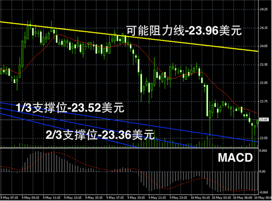 白银阴阳烛录得整体仍然低于红色日平均移动线,短线MACD显示空头运行趋势明显,预期未来可能会继续小幅回调。