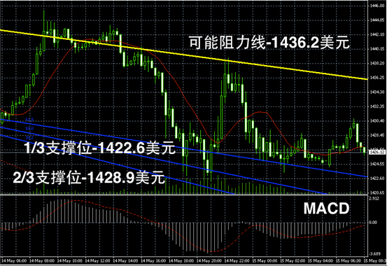 长线阴阳烛录得红色日平均移动系统明显转为下行趋势,且阴阳烛连续录得处于Fibonacci区间低位支撑位附近,长线RSI转为下行,预期未来或可能迎来新一轮的下行趋势,短线震荡区间可能调整为1400 – 1430 美元区间。