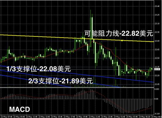 白银长线阴阳烛末端录得出现阴烛,且已经触及Fibonacci低位支撑22.18美元附近,未来如果跌破这一支撑位,则可能继续下行。