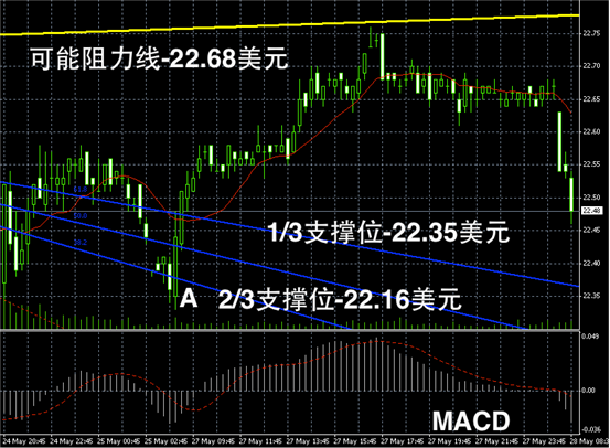 白银长线阴阳烛录得基本持稳在22.5美元附近震荡,长线RSI已转为下行,目前录得38,长线MACD空头继续浮动。未来如果不能突破23美元的话,则可能继续偏空窄幅震荡。