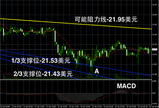 白银阴阳烛录得柱体较短,整体分布于红色日平均移动线中位,短线MACD多头或空头均不明显,未来或继续区间低位窄幅震荡。