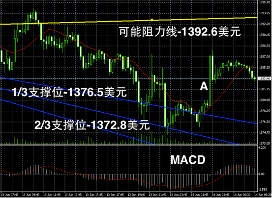 黄金阴阳烛录得整体离散率较大,且前后大幅交叉于红色日平均移动线上下,不过最终仍然持稳在1380美元以上,显示此支撑位的牢固。短线MACD显示多头或空头反复,未来或继续区间震荡,低位支撑可首先参考阳烛A的最低价。