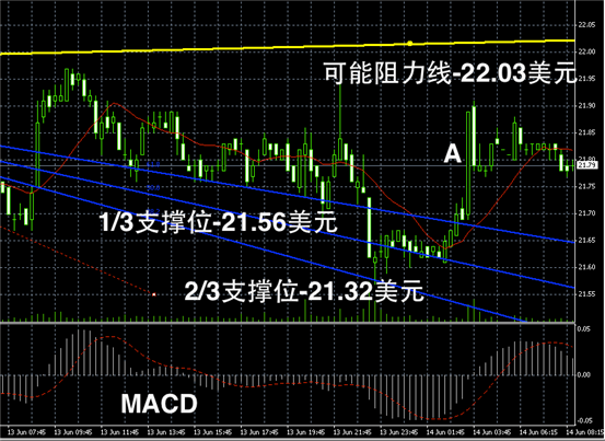 白银浮动在21 – 22 美元区间之后,继续做空头动能积聚,长线MACD有见长趋势,中期仍旧偏空下行,短线或先窄幅震荡。