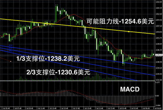 黄金阴阳烛录得区间滑落后,柱体收短,且末端柱体处于红色日平均移动线中位,短线MACD空头主导后有所消散,预期未来或在1250美元附近持稳震荡。