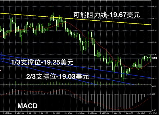 白银阴阳烛录得下行后,出现了U型反弹,显示低位支撑依旧牢固,反弹后柱体录得聚焦明显,短线MACD显示空头有所消散,预期未来或进一步在19.5美元附近持稳震荡。