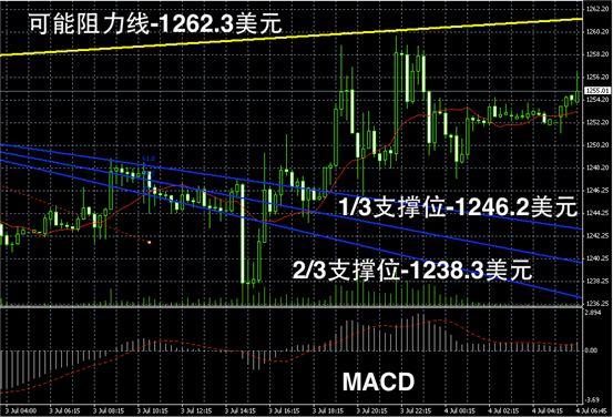 黄金阴阳烛录得上行后,柱体收短,且处于红色日平均移动线中位,整体离散率仍然较大,短线MACD显示多头有所消散,预期未来或继续围绕1250美元附近震荡。