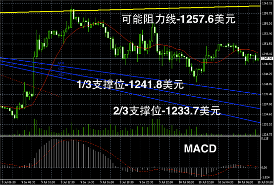 黄金阴阳烛录得柱体较短,且平均分布在红色日平均移动线中位,短线MACD显示多头或空头均不明显,预期未来或继续围绕1250美元附近震荡,低位支撑可参考阳烛A的最低价。