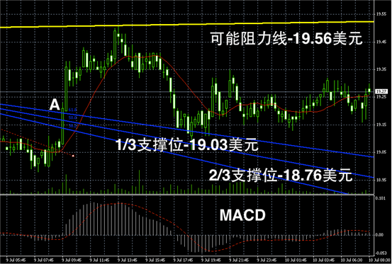 白银阴阳烛录得离散率加大,柱体录得前后阴阳烛间隔出现,短线MACD显示多头或空头均不明显,短线或浮动在19美元附近震荡。