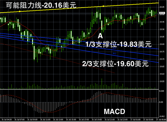 白银阴阳烛录得反弹后,前后阴阳烛间隔出现,且整体处于红色日平均移动线中位,短线MACD显示弱势多头主导,预期仍有部分反弹空间,低位支撑可参考阴烛A的最低价。