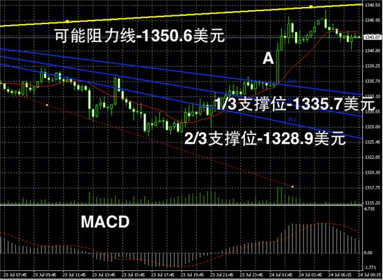 黄金阴阳烛录得阶梯上行趋势明显,后期柱体收短,且平均分布在红色日平均移动线中位,短线MACD显示弱势多头主导,预期或仍有部分上行空间,直到触及1350美元附近的阻力线,低位支撑可参看阳烛A的最低价。