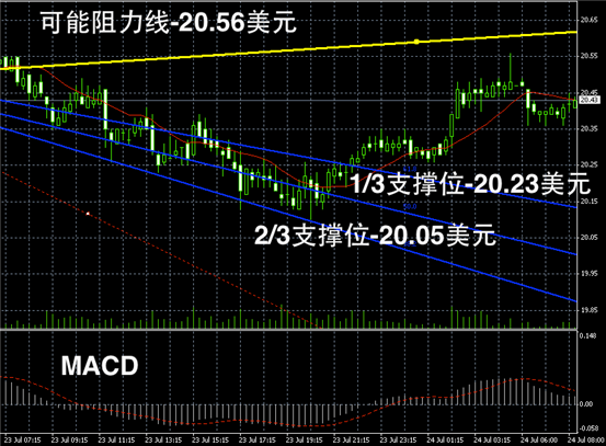 白银阴阳烛震荡比较平缓,柱体平均分布在红色日平均移动线中位,单线MACD显示多头或空头轮番主导,预期或继续在区间中位窄幅震荡。