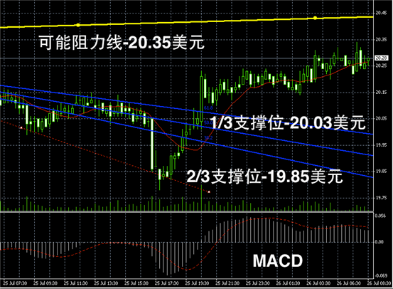 白银阴阳烛录得反弹后,柱体平均分布在红色日平均移动线中位,短线MACD显示弱势多头主导,预期或仍有部分反弹空间,不过20.5美元附近阻力较大。