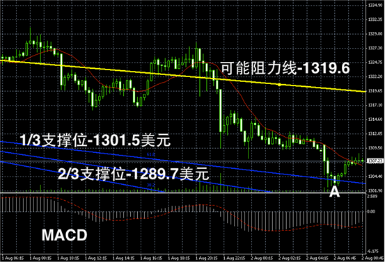 黄金阴阳烛录得整体低于红色日平均移动线,且录得阴烛增多,末端聚焦明显,有小幅反弹趋势,短线MACD显示弱势空头主导,预期或继续偏空震荡,低位支撑可参考阴烛A的最低价,若跌破或继续下行。