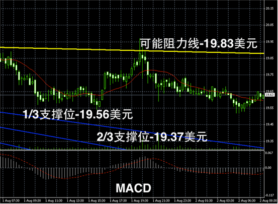 白银阴阳烛分布较为均匀,前后比值差异小,离散率下降,短线MACD显示弱势空头主导,预期或继续在19 – 19.5 美元区间内窄幅偏空震荡。