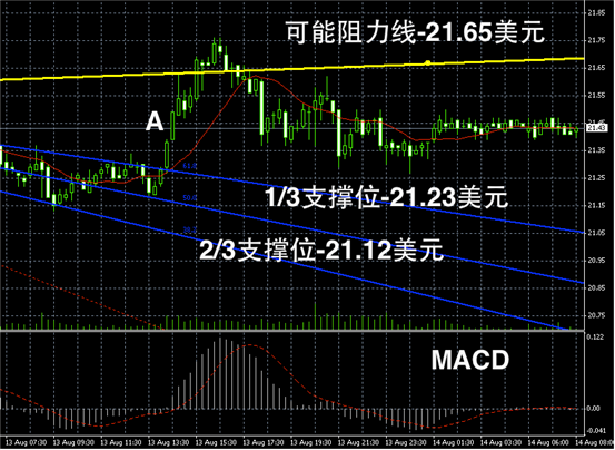 白银长线阴阳烛录得柱体继续高于红色日平均移动线,长线MACD录得DIF线显示多头见长。RSI则录得上行至70附近,不过小幅持平。预期或首先在21.5美元附近小幅震荡。