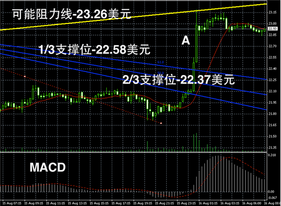 白银阴阳烛录得反弹后,柱体收短,平均分布在红色日平均移动线中位,高位聚集明显,短线MACD显示弱势多头主导,预期未来或首先在高位区间持稳震荡,低位支撑可参考阳烛A的最低价。
