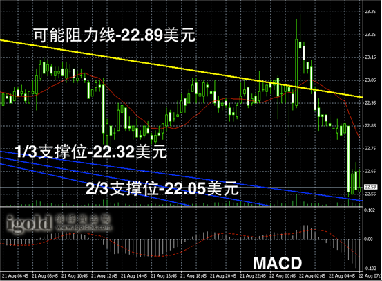 白银阴阳烛录得前后阴阳烛间隔出现,且比值较大,后期柱体低于红色日平均移动线,短线MACD显示空头主导,预期短线或继续区间下行,若跌破22.3美元,则可能进一步走跌。
