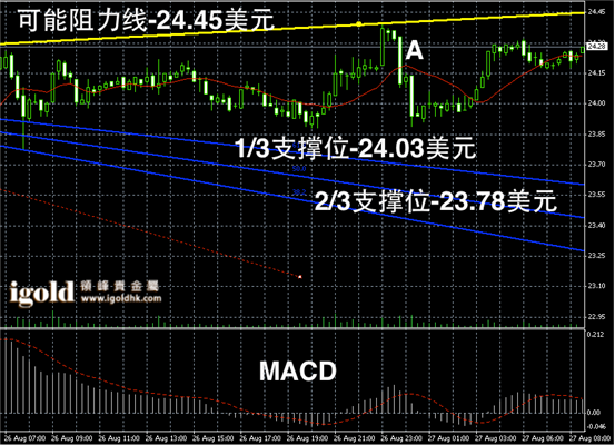 白银长线阴阳烛在Fibonacci第二区间的上行趋势非常明显,长线MACD则录得继续上扬,RSI录得在81附近,处于超买区域,回落风险加大,不过预期白银价格可能仍然会继续冲击24.6美元附近的阻力线。