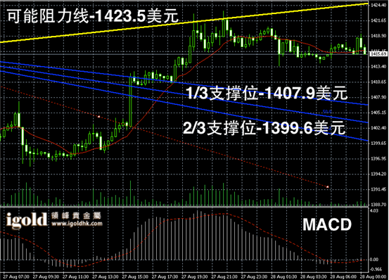 黄金阴阳烛录得上行后柱体有所收短,且整体处于红色日平均移动线中位,短线MACD显示多头有所消散,短线或在区间高位窄幅整理,黄金价格或可能再次冲击1420美元阻力线,随后或进行区间回调。