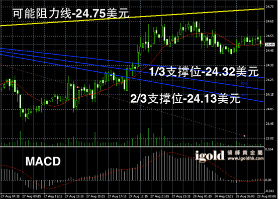 白银阴阳烛录得小幅上扬后,前后阴阳烛间隔出现,柱体高低交叉于红色日平均移动线中位,短线MACD显示多头有所回落,短线或继续在24.5美元附近窄幅震荡。