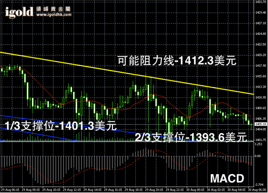 黄金阴阳烛录得柱体前后高低交叉于红色日平均移动线中位,后期录得阴烛增多,短线MACD仍然弱势主导,预期短线或继续在1410美元附近作窄幅震荡,整体仍然有所偏空。