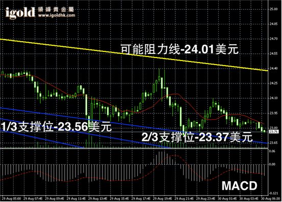 白银阴阳烛录得柱体多数低于红色日平均移动线,后期阴烛有所增多,短线MACD显示弱势空头主导,预期白银或仍有部分下行空间,不过23.7美元附近的支撑位比较难以跌破。