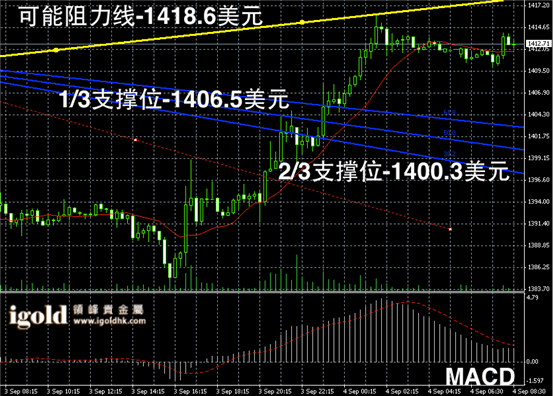 黄金长线阴阳烛录得柱体再次高于红色日平均移动系统,且形成了底部三角,后期有可能继续反弹,长线MACD显示多头主导,RSI则开始反弹,录得67附近,在未接近70之前,黄金价格有可能冲击1420美元附近震荡。